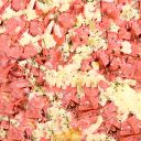 Molho de tomate, mussarela, frango desfiado, calabresa em rodelas, coração, filé de gado e orégano.